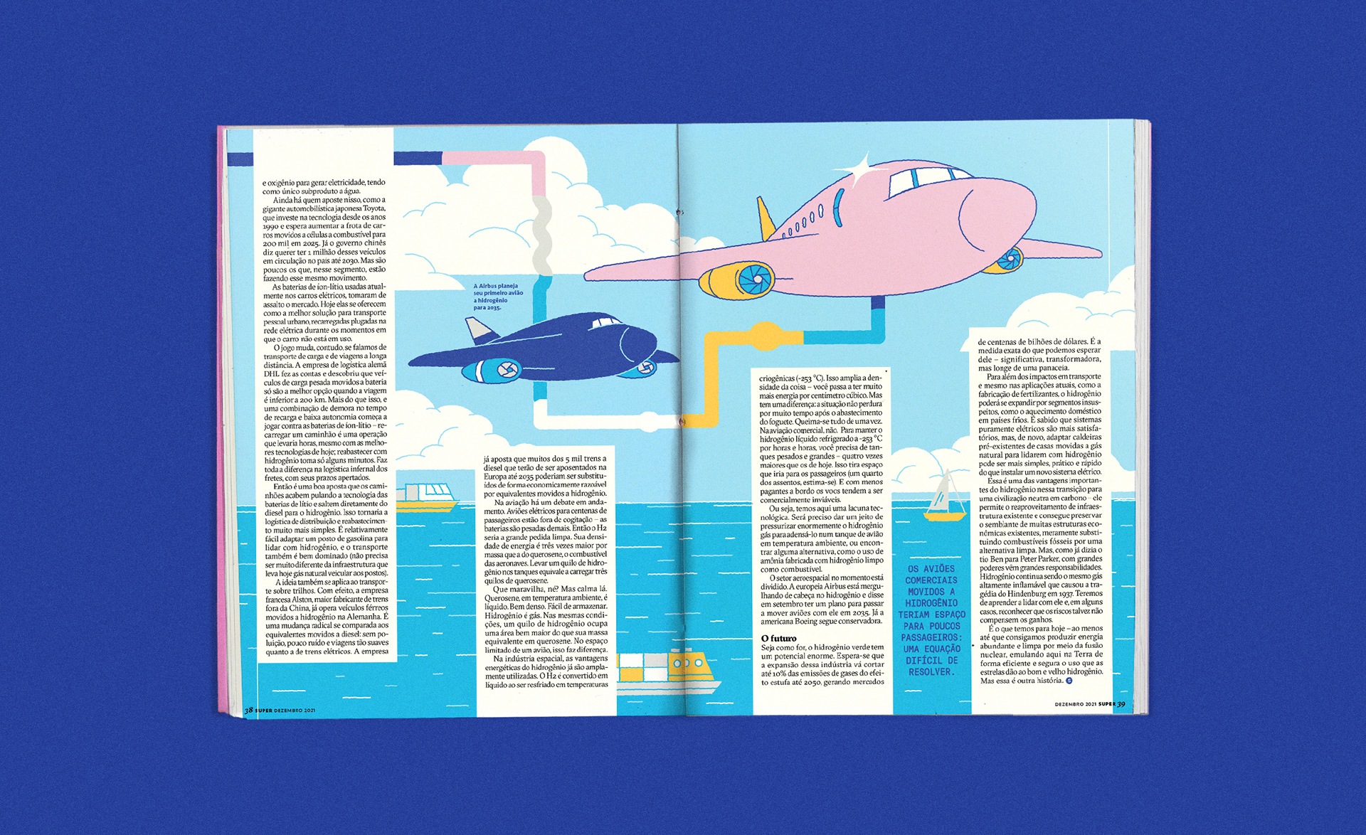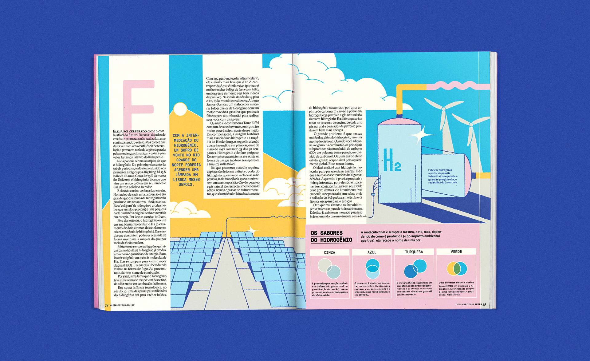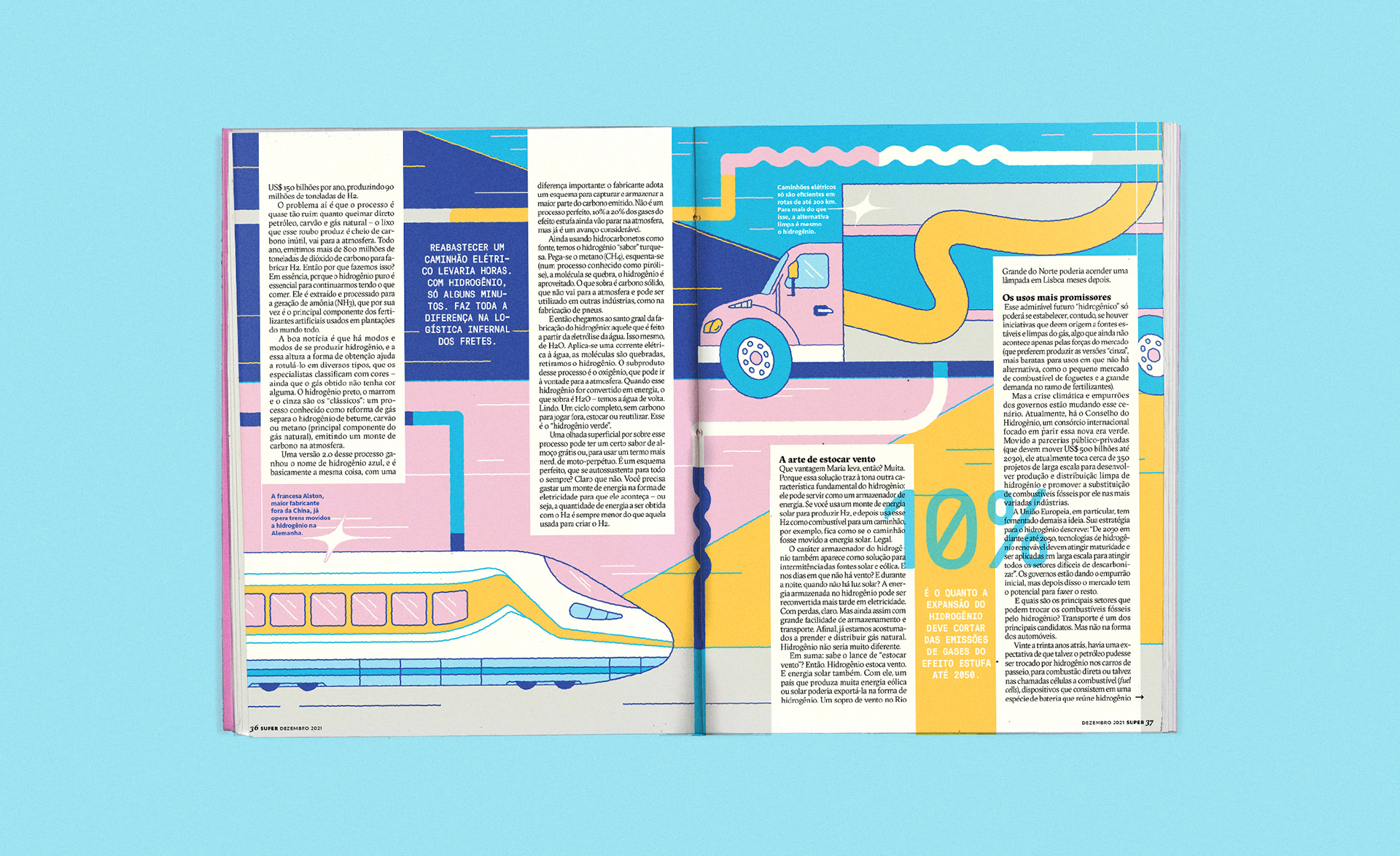 Ilustrações para a matéria "Hidrogênio - As perspectivas reais", publicada na última edição de 2021 da Superinteressante. Ilustração Clara Candelot Design Natalia Sayuri Lara Texto Salvador Nogueira Edição Alexandre Versignassi