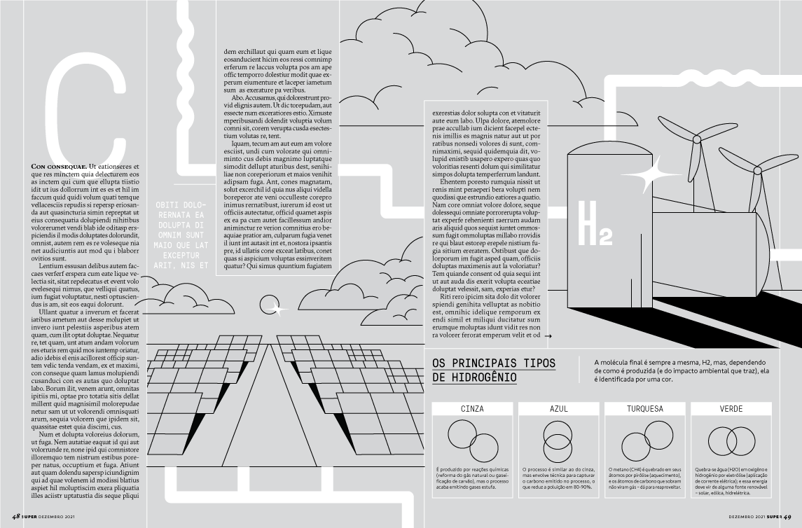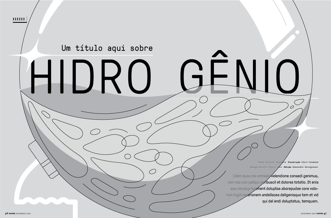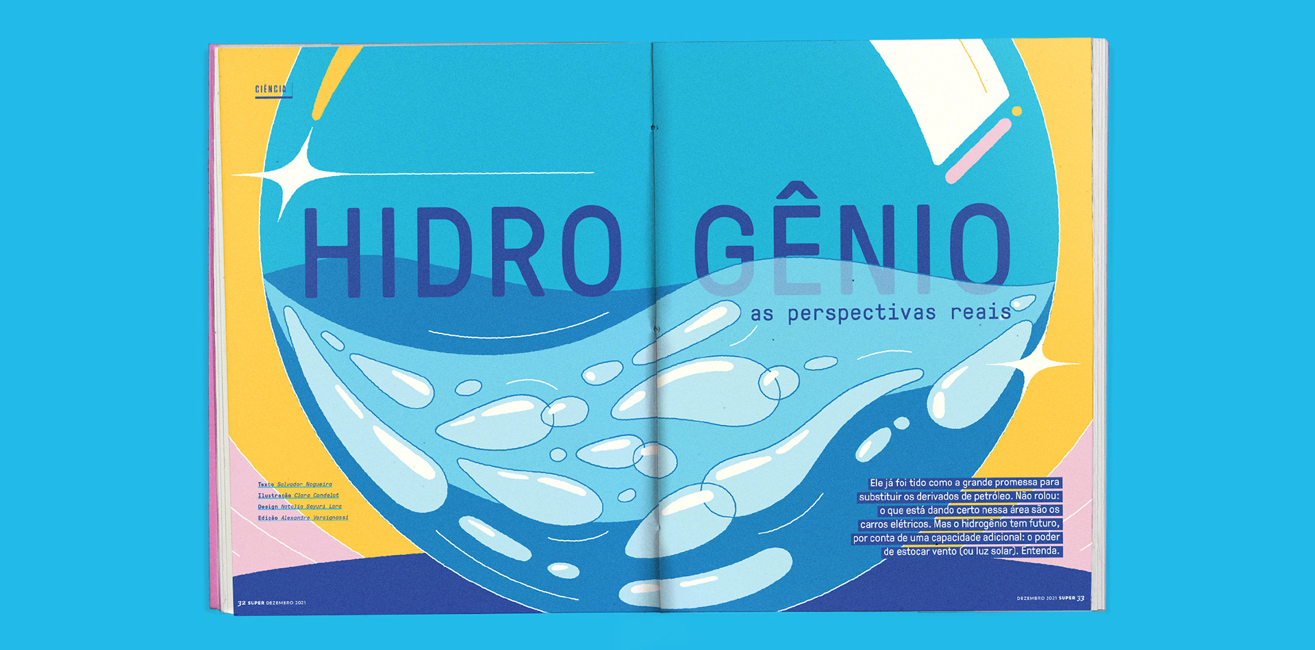 Ilustrações para a matéria "Hidrogênio - As perspectivas reais", publicada na última edição de 2021 da Superinteressante. Ilustração Clara Candelot Design Natalia Sayuri Lara Texto Salvador Nogueira Edição Alexandre Versignassi